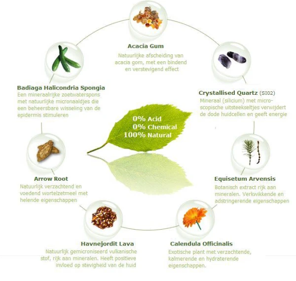 Een 100% natuurlijke peeling op basis van kruiden, zee-algen en plantenextracten. In tegenstelling tot chemische peelings werkt deze behandeling door de huid te stimuleren zichzelf te vernieuwen. De microdeeltjes uit de kruiden activeren de doorbloeding en celvernieuwing, waardoor de huid van binnenuit wordt verbeterd.